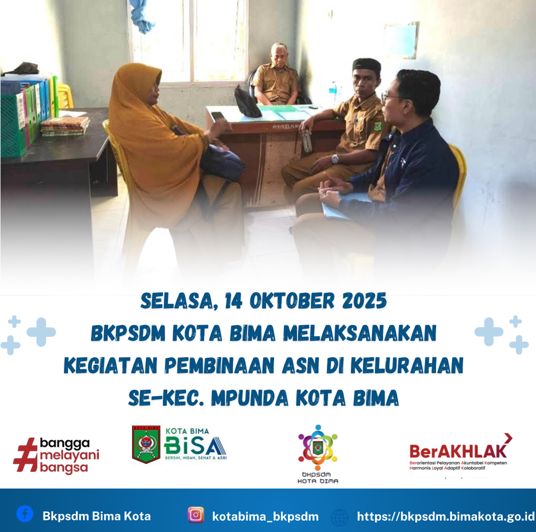 Selasa, 14 Oktober 2025 BKPSDM Kota Bima Melaksanakan Kegiatan Pembinaan ASN di Kelurahan Se-Kecamatan Mpunda Kota Bima. Pembinaan ASN (Aparatur Sipil Negara) adalah proses meningkatkan kemampuan dan kapasitas ASN untuk melaksanakan tugas dan tanggung jawabnya secara efektif dan efisien. Ini mencakup berbagai aspek, seperti Peningkatan Kapasitas dan Keterampilan Melalui pelatihan dan pengembangan keterampilan, ASN dapat meningkatkan kemampuan teknis dan manajerialnya. Pengembangan Kompetensi sehingga Pemberdayaan ASN bertujuan untuk meningkatkan kompetensi ASN dalam melaksanakan tugas dan tanggung jawabnya.