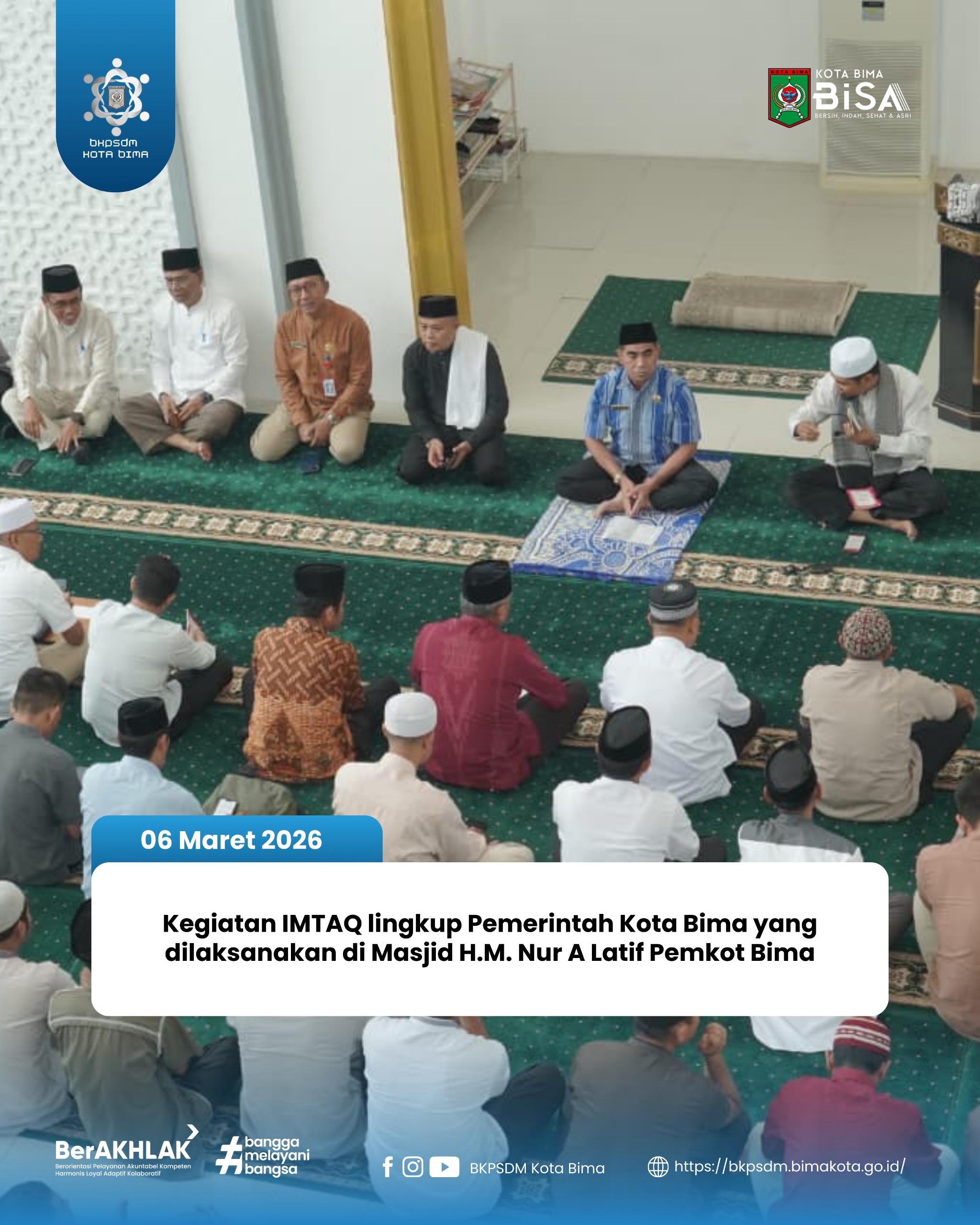 Jumat, 06 Maret 2026 Pukul 00.00 WITA berlokasi di Masjid H.M. Nur A. Latif Kota Bima dilaksanakan Kegiatan Imtaq rutin ini merupakan bagian dari upaya Pemkot Bima untuk memperkuat karakter ASN agar tidak hanya profesional dalam bekerja, tetapi juga memiliki landasan moral dan spiritual yang kuat.