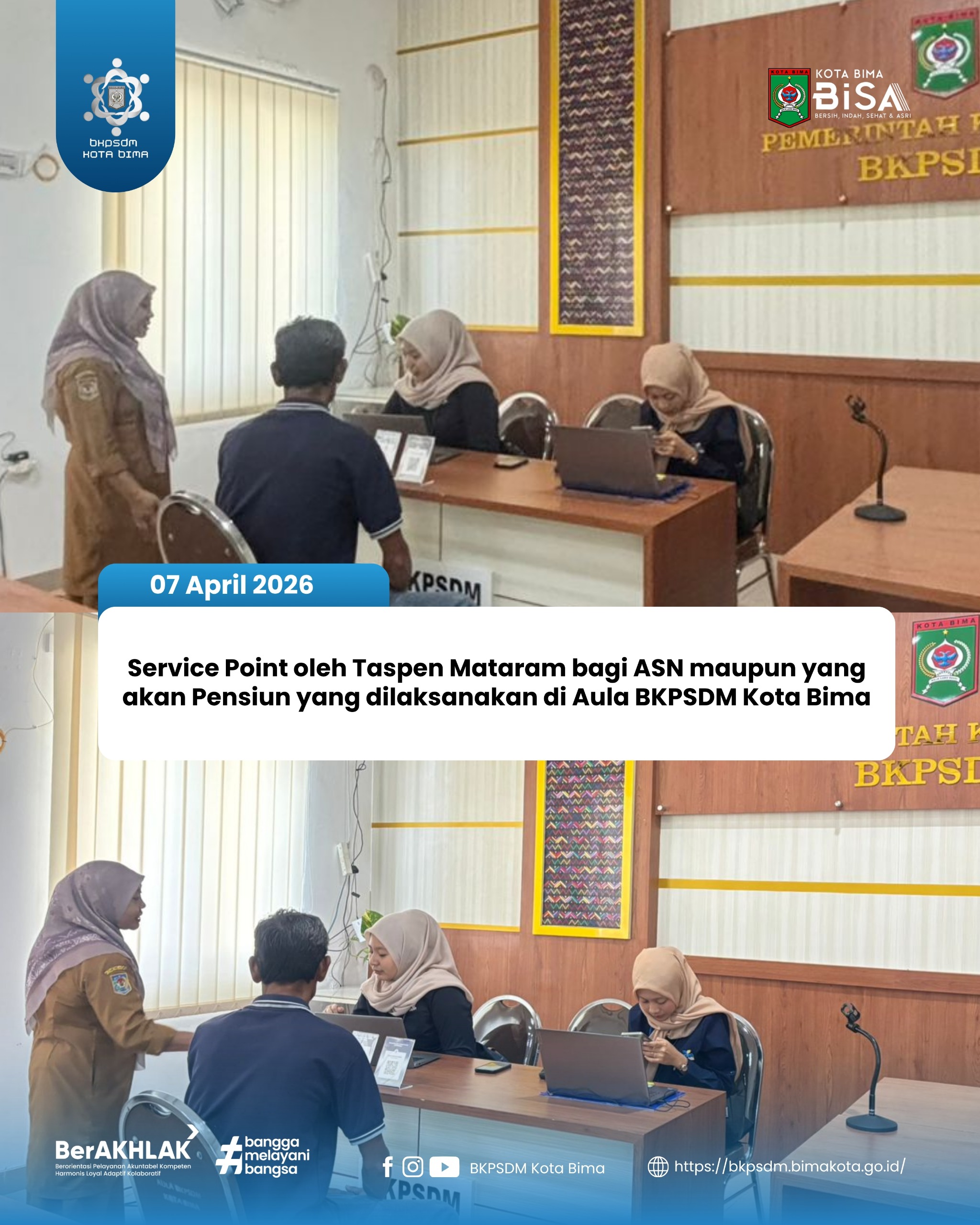 Selasa, 07 April 2026 Pukul 09.00 WITA BKPSDM Kota Bima menerima kunjungan rutin PT. Persero Taspen Mataram BUlan April Tahun 2026 yang  berlokasi di Aula Kantor BKPSDM Kota Bima. PT Taspen menjalin kerja sama strategis dengan pemerintah daerah (Pemda) di seluruh Indonesia, seperti pada Pemerintah Kota Bima , ntuk memfasilitasi pembayaran tabungan purnabakti, pensiun, serta layanan perbankan bagi Aparatur Sipil Negara (ASN) yang akan memasuki masa pensiun.