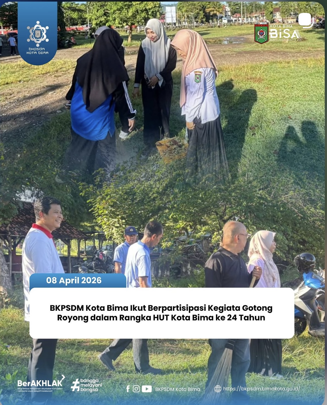 Rabu, 08 April 2026 Pukul 07.00 WITA Berlokasi di Seputaran Kantor Ex Bupati Bima BKPSDM Kota Bima melaksanakan gotong royong menyambut HUT Kota Bima Ke-24 Tahun.