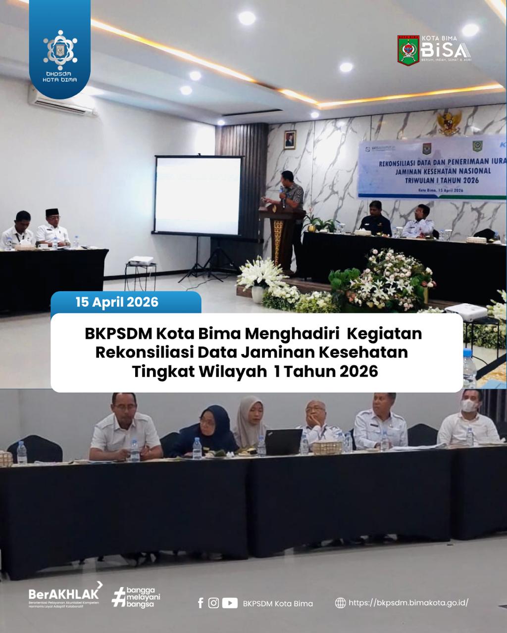 Rabu, 15 April 2026 Pukul 10.00 WITA berlokais di Rumah Dining Kota Bima, BKPSDM Kota Bima menghadiri kegiatan Rekonsiliasi Data Jaminan Kesehatan Tingkat I Tahun 2026. Rekonsiliasi data jaminan kesehatan adalah proses pencocokan dan validasi data kepesertaan serta iuran BPJS Kesehatan antara berbagai pihak (BPJS, Pemda, Kemenkes, BPS) untuk menjamin akurasi, validitas, dan ketepatan sasaran.