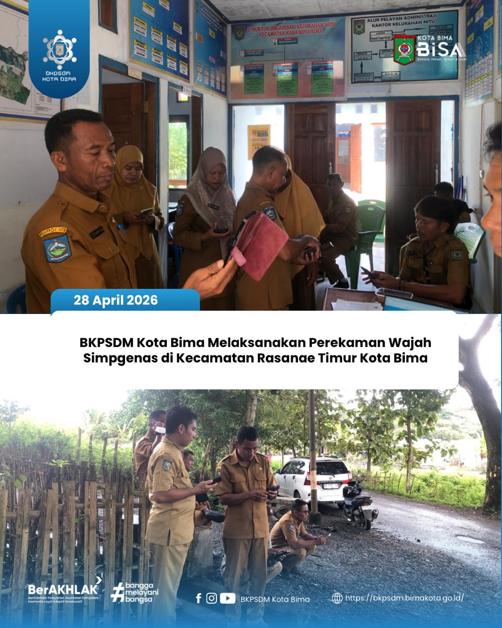 Selasa, 28 April 2026 Pukul 08.30 WITA BKPSDM Kota Bima Melasanakan Perekaman Wajah Melalui Aplikasi Simpegnas di Kecamatan Rasane Timur Kota Bima. Perekaman wajah SIMPEGNAS adalah sistem autentikasi biometrik pada aplikasi presensi online ASN berbasis face recognition yang terintegrasi dengan BKN.