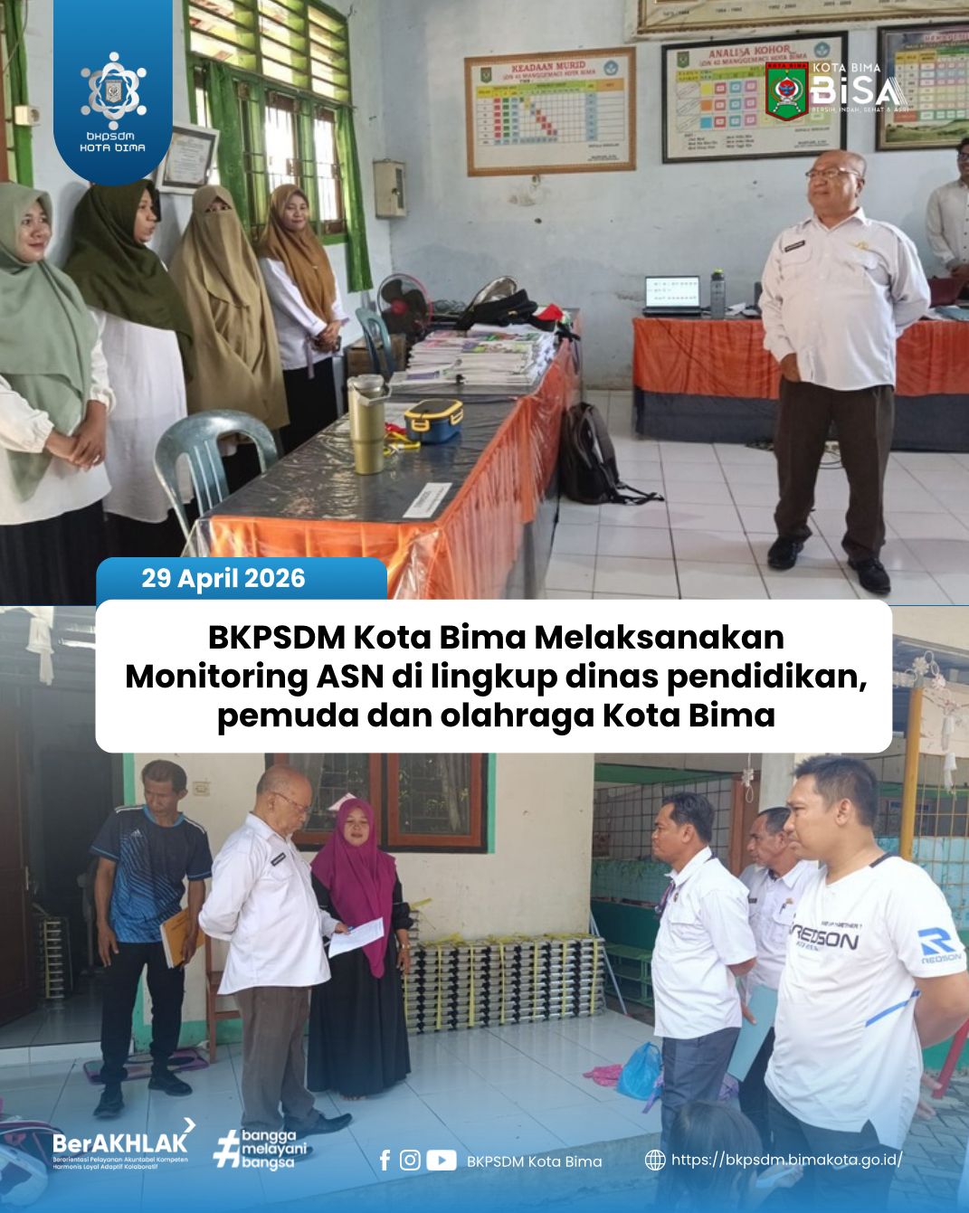 Rabu, 29 April 2026 Pukul 08.30 WITA BKPSDM Kota Bima Melaksanakan Monitoring ASN di Lingkungan di Dinas Pendiidkan, Pemuda dan Olahraga Kota Bima.Monitoring ASN di dinas adalah proses pemantauan, pengawasan, dan evaluasi kinerja serta disiplin Aparatur Sipil Negara (ASN) secara terintegrasi untuk memastikan kepatuhan terhadap peraturan, efisiensi kerja, dan akuntabilitas.